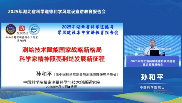 本次报告会特邀中国科学院院士、中国科学院精密测量科学与技术创新研究院研究员孙和平作专题宣讲报告。孙院士以“测绘技术赋能国家战略新格局,科学家精神照亮荆楚发展新征程”为题,通过回顾我国大地测量与地球物理学奠基人方俊院士的学术人生,系统梳理了这位科学巨匠的卓越贡献。从筚路蓝缕开创学科体系,到勤能补拙攻克技术难关;从严于律己的治学态度,到奖掖后学的育人情怀,孙院士生动诠释了爱国、创新、求实、奉献、协同、育人的科学家精神内涵。