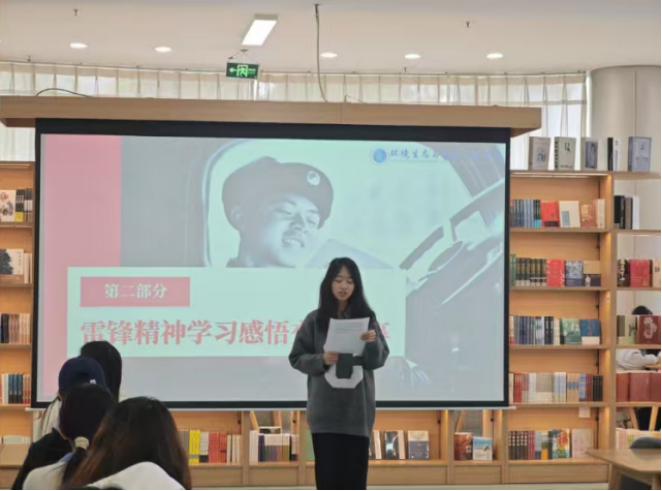 在分享环节,来自各支部的7名学生代表围绕“雷锋精神的时代内涵”“新时代青年如何践行雷锋精神”等主题展开交流,并结合自身学习生活实际分享感悟。来自本科生第一党支部林肖倩同学表示,雷锋是一位“追光的人”,我们要主动在自己的岗位上发光发热,以行动诠释“向上”与“向善”,要发挥专业所长,让红色基因在时代浪潮中焕发生机,在强国建设的征程中写下属于这一代人的“雷锋日记”。来自本科生第二党支部的何雨桐同学感慨道,雷锋用一件件平凡小事诠释了精神的伟大,他的“螺丝钉精神”和为民服务的初心,早已融入民族血脉,作为新时代青年,我们要将雷锋精神内化于心、外化于行,让这份精神在日常生活中绽放新光彩。